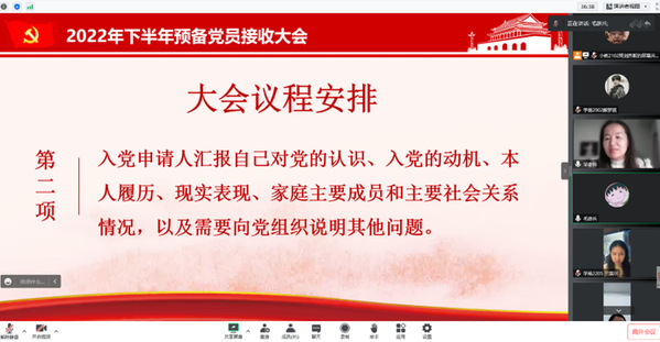 11月13日晚19:00,威廉希尔亚洲公司研究生党支部在腾讯会议召开2022年下半年预备党员接收大会。威廉希尔亚洲公司党委副书记王永胜、学生第三党支部书记邹焱萍、研究生党支部书记韦耀阳、支委余杏琪及李坤艳出席会议,研究生党支部学生党员及发展对象毛彦兵参加会议。本次会议由学生第三党支部书记邹焱萍主持。