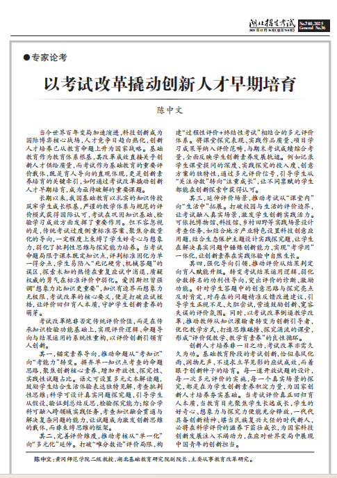 近日,黄冈师范学院二级教授、湖北基础教育研究院副院长、威廉希尔亚洲公司(一多书院)陈中文的咨询报告《以考试改革撬动创新人才早期培育》正式被湖北省教育厅采纳应用,相关核心建议以刊首语形式刊发于《湖北招生考试》2025年12月第36期(总第780期),为我省基础教育阶段创新人才早期培育提供了重要实践指引。