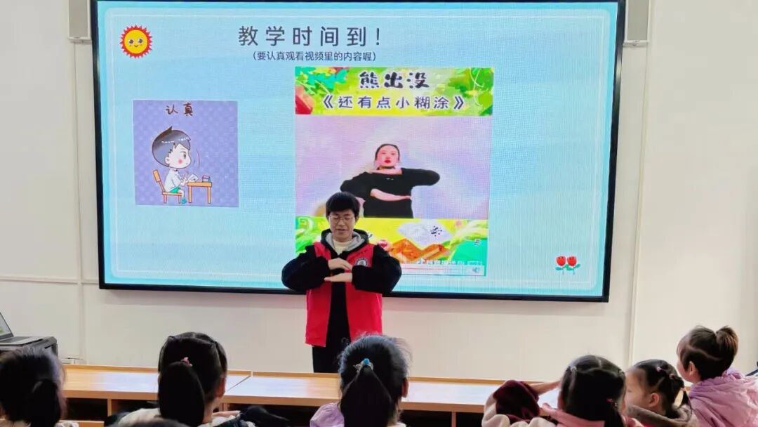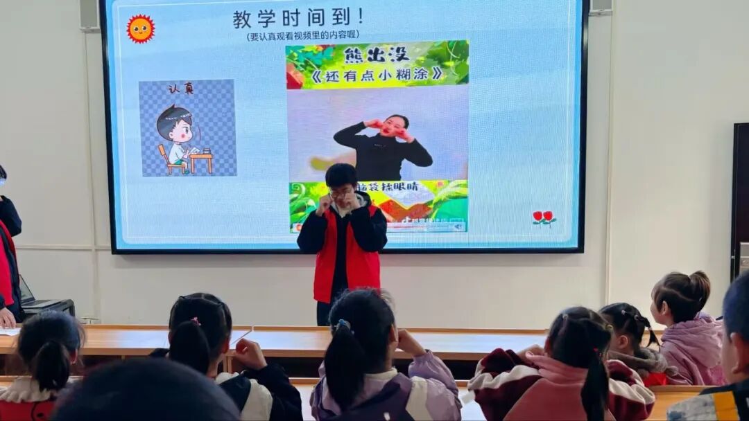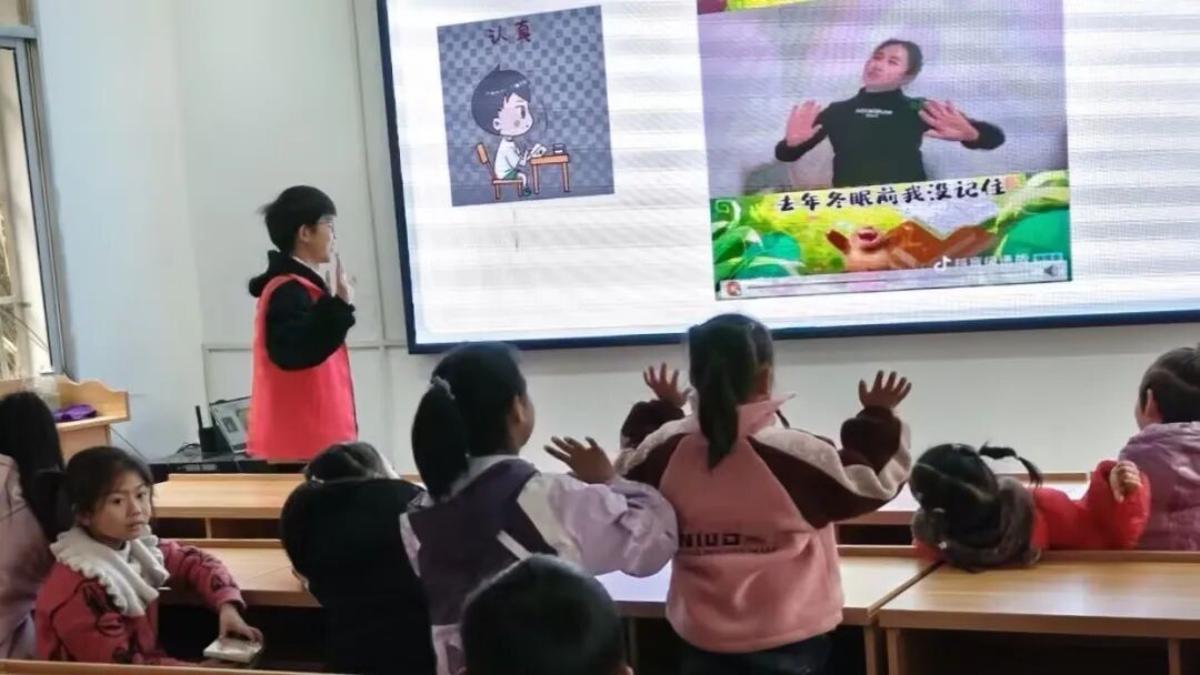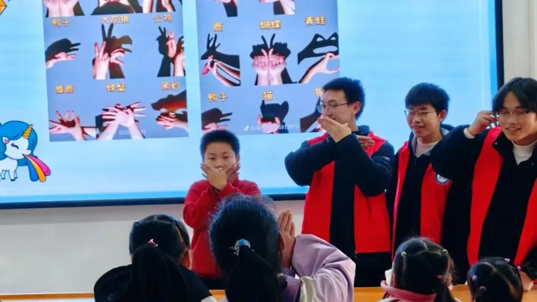 教学环节里,志愿者老师们化身“指尖导师”,站在大屏幕前面对面示范。他们先带着孩子们玩“手影动物猜一猜”“手指数字抱团”等小游戏,锻炼孩子们的手部灵活性;随后拆解手势舞的动作,从摆臂、翻手到配合节奏的肢体律动,耐心地逐帧带领孩子们练习。孩子们眼神专注,紧紧跟着志愿者的示范,抬手、翻腕、合指,稚嫩的动作里满是认真。志愿者们穿梭在孩子们之间巡回指导,及时纠正动作细节,确保每个孩子都能跟上教学节奏。