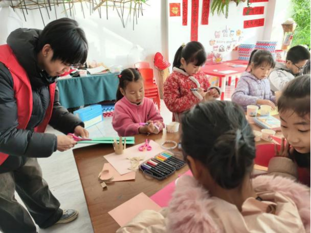在志愿者老师的耐心示范下,简单的纸杯仿佛被施了魔法。剪一剪,贴一贴,画一画……一个个平淡无奇的纸杯,在孩子们手中逐渐变成了憨态可掬的小雪人、灵动可爱的小章鱼、五彩斑斓的小灯笼。“启明星”社会实践团队的志愿者们穿梭在孩子们中间,时而指导技巧,时而鼓励创意,确保每一位“小艺术家”都能安全、快乐地享受创作过程。