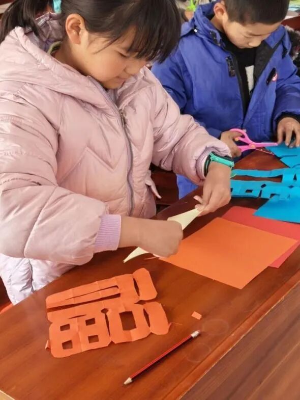 听完志愿者的讲解,孩子们便开始动手制作自己的“福”字了。志愿者们一步步示范:正方形红纸对折、描画半边“福”字、剪刀先从细微处入手、再剪外轮廓……孩子们认真地听,小手里握着剪刀,小心翼翼地在红纸上剪出形状。有的孩子还为“福”字添上一朵小花、一圈波浪,让作品更有生机。志愿者们轻声穿梭在孩子之间,时而弯腰指导握剪姿势,时而鼓励孩子大胆下刀,时而用镜头记录下那专注的侧脸与成功的笑容——教室里,红纸屑轻轻飘落,剪刀声嚓嚓作响,每一个“福”字都承载着孩子们的心意与创造。