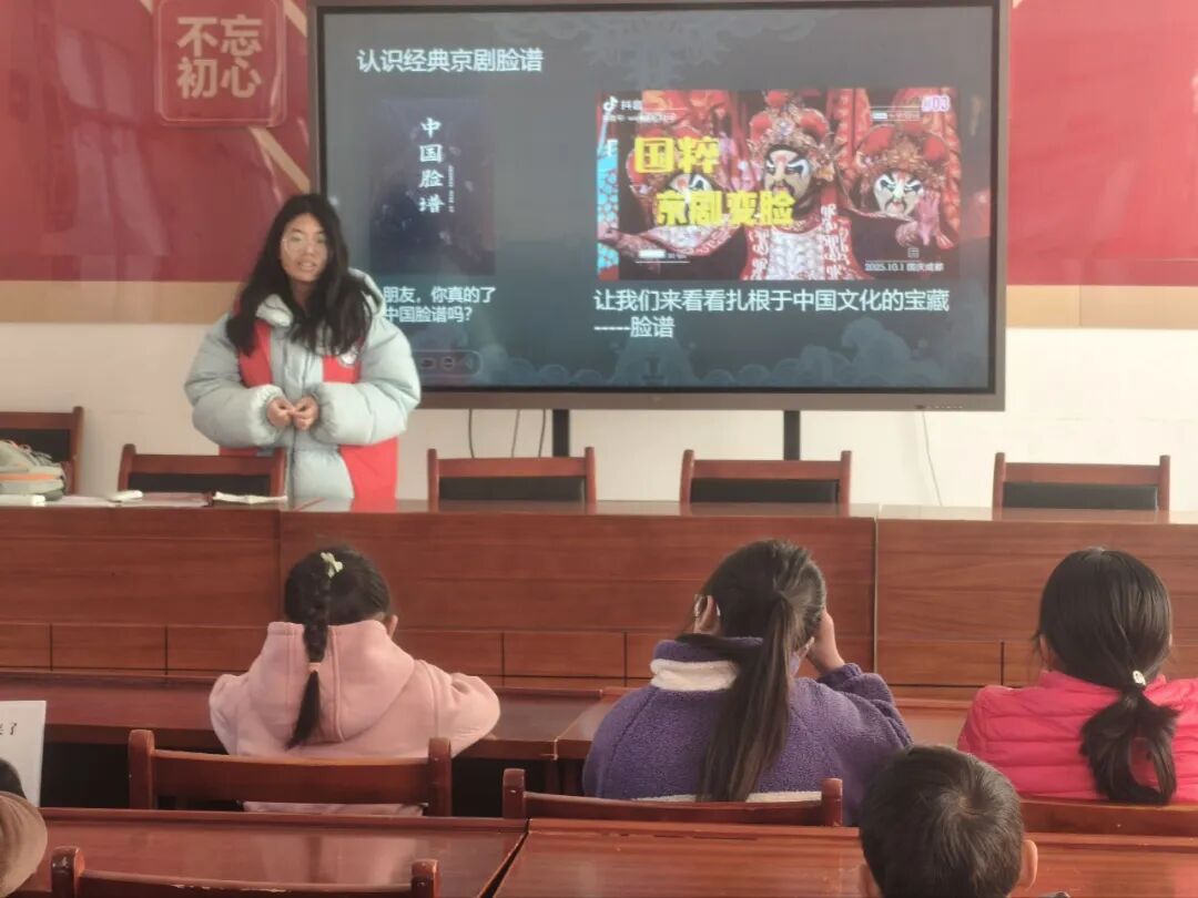 冬意渐浓,文化暖心。11月29日上午,黄冈师范学院一多书院"启明星"社会实践团队走进罗田县黄冈庙乡村“希望书屋”,开展了一场以"脸谱绘韵:国粹与文化感知坊"为主题的文化志愿活动。通过生动讲解、趣味互动和创意绘制,志愿者们带领孩子们领略京剧脸谱的独特魅力,在色彩与线条间感受中华优秀传统文化的深厚底蕴。