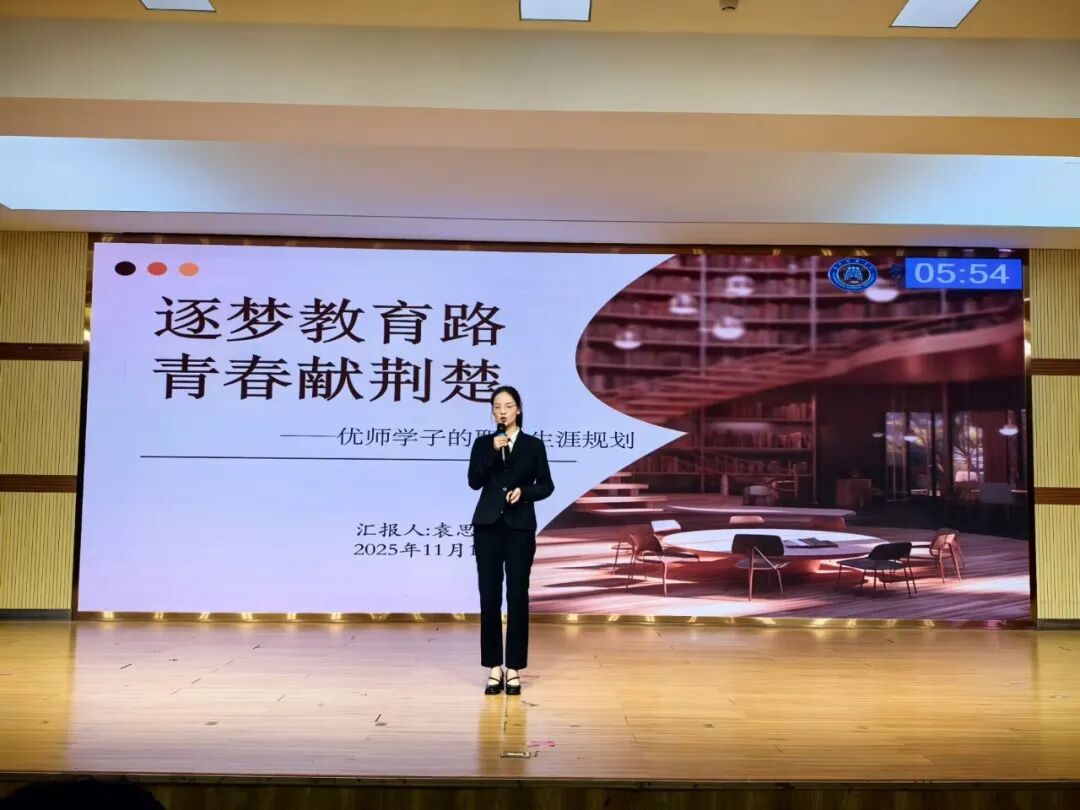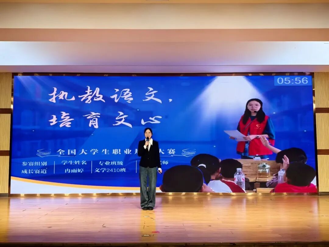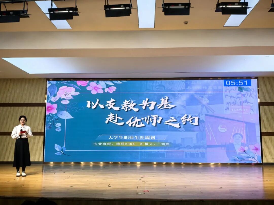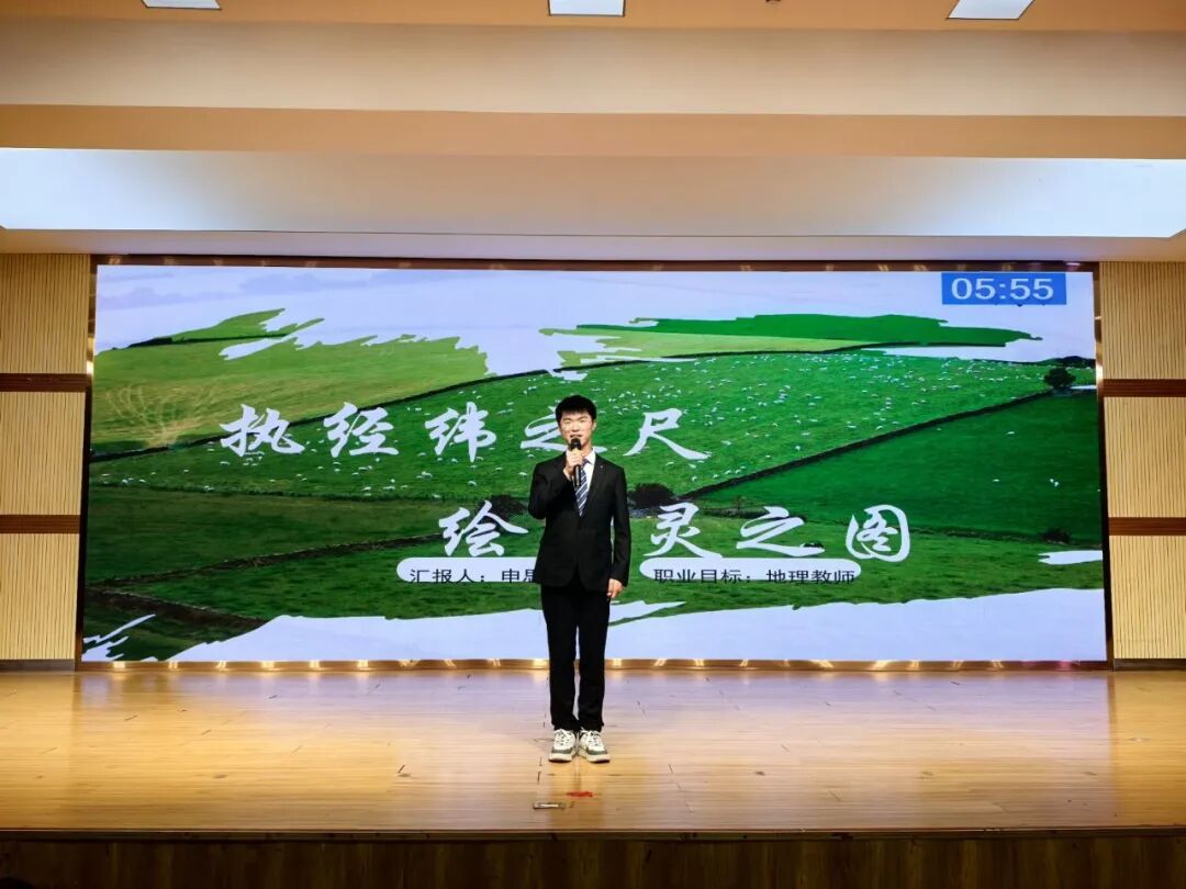 比赛现场氛围热烈而有序,灯光聚焦的舞台上,参赛选手依次登台展示。他们借助精心制作的PPT,围绕自我认知、职业目标等核心模块,结合教育专业特色、个人兴趣特长与行业发展趋势,生动阐述职业规划蓝图。有的选手聚焦基础教育领域,详细规划从实习教师到骨干教师的成长路径;有的选手结合跨学科发展趋势,构建“教育+科技”的职业发展框架。展示过程中,选手们精神饱满、表达流畅,面对评委老师的现场提问,从容应答、逻辑清晰,充分展现了扎实的专业素养、清晰的思维能力与积极向上的精神风貌。领导老师认真聆听,依据展示内容与现场表现公正评分、精准点评,助力学子进一步明确职业方向、优化规划方案。