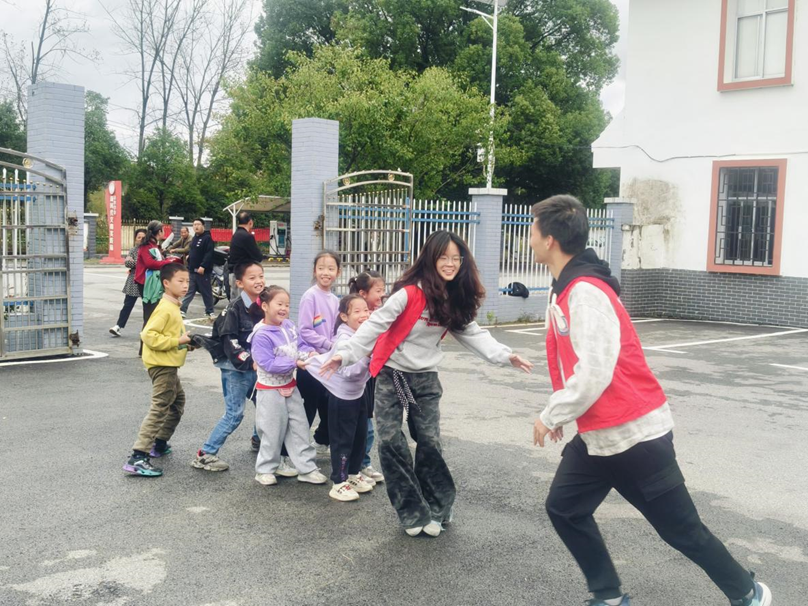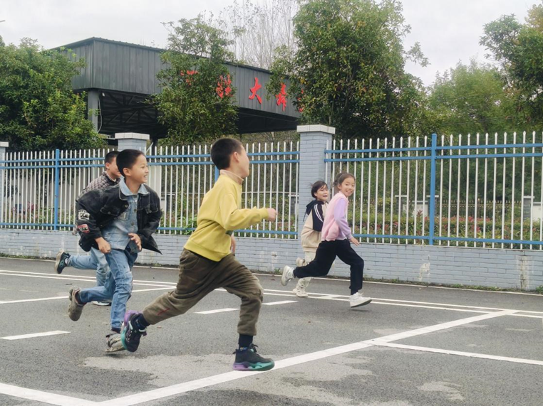 渐渐的,活动场地转移到户外操场。志愿者们组织孩子们玩起了经典游戏“老鹰捉小鸡”和“木头人”。虽然是阴天,但是孩子们心情十分欢乐,脸上纷纷露出了明媚的笑容,孩子们尽情奔、躲闪、定格,欢声笑语在操场上回荡。“老鹰捉小鸡”中灵活的躲闪,展现了孩子们的反应力与协作精神;“一二三,木头人”时的瞬间静止,则考验着他们的自控与专注。这些经典游戏不仅让孩子们锻炼了身体,更在自然互动中释放情绪、体验规则与自由的平衡。