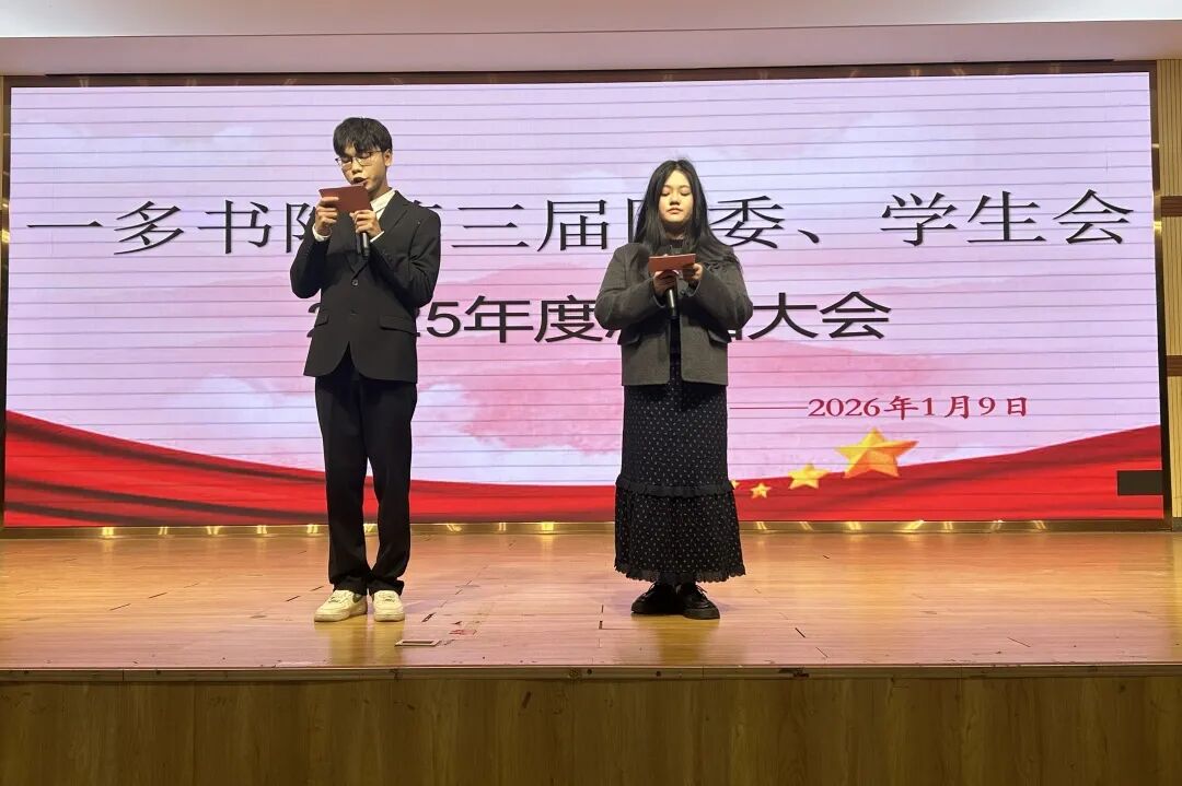 202619日晚,一多书院(优师计划)团委、学生会年终总结大会在北区一站式学生社区大学生活动中心正式召开。本次大会以“书院深耕优师志,团学实干践初心”为主题,系统回顾学年工作,表彰先进典型,并对未来发展作出展望。书院团委书记胡涵伊、辅导员曹钰涓,以及团委、学生会全体成员、主持队队员共同参会。会议由主持队张砚溪、李明悦同学主持。